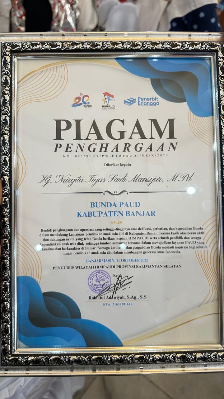 Piagam penghargaan diberikan langsung oleh Ketua PW HIMPAUDI Provinsi Kalsel, Rabiatul Adawiyah, kepada Bunda PAUD Banjar, Hj Nurgita Tiyas, dalam momen Peringatan HUT ke-20 HIMPAUDI dan Pembukaan Jambore IV HIMPAUDI Kalsel, di Gedung Mahligai Pancasila, Banjarmasin, Sabtu (11/10/2025) pagi.
