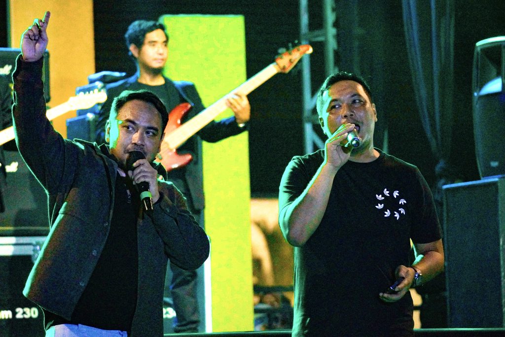 Duet Bebi Romeo (kiri) dan Wali Kota Aditya (kanan) memungkasi Banjarbaru Murdjani Festival 2023, Sabtu (9/12/2023) malam. Foto: medcenbjb