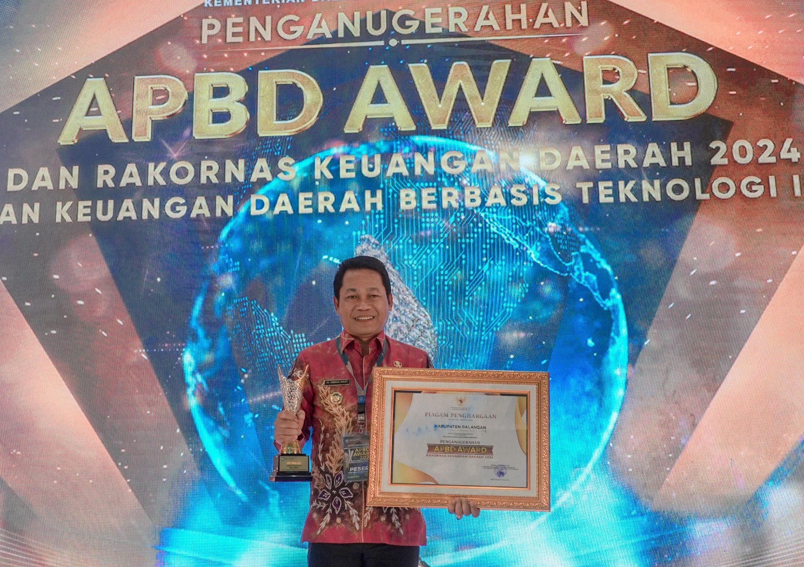 Usaha dan kerja keras Bupati Balangan Abdul Hadi akhirnya membuahkan hasil yang membanggakan. Pada ajang APBD Award 2024 yang diselenggarakan oleh Kementerian Dalam Negeri Republik Indonesia (Kemendagri), Rabu (18/12/2024), Bupati Balangan Abdul Hadi berhasil meraih penghargaan sebagai 5 kabupaten dengan realisasi pendapatan daerah tertinggi se Indonesia.