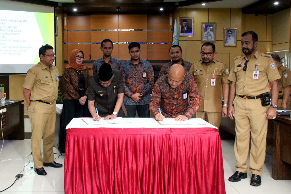 PT PLN Unit Induk Wilayah Kalselteng melakukan perjanjian kerjasama tentang pemungutan dan penyetoran pajak penerangan jalan dan pembayaran rekening listrik Pemkab Banjar.