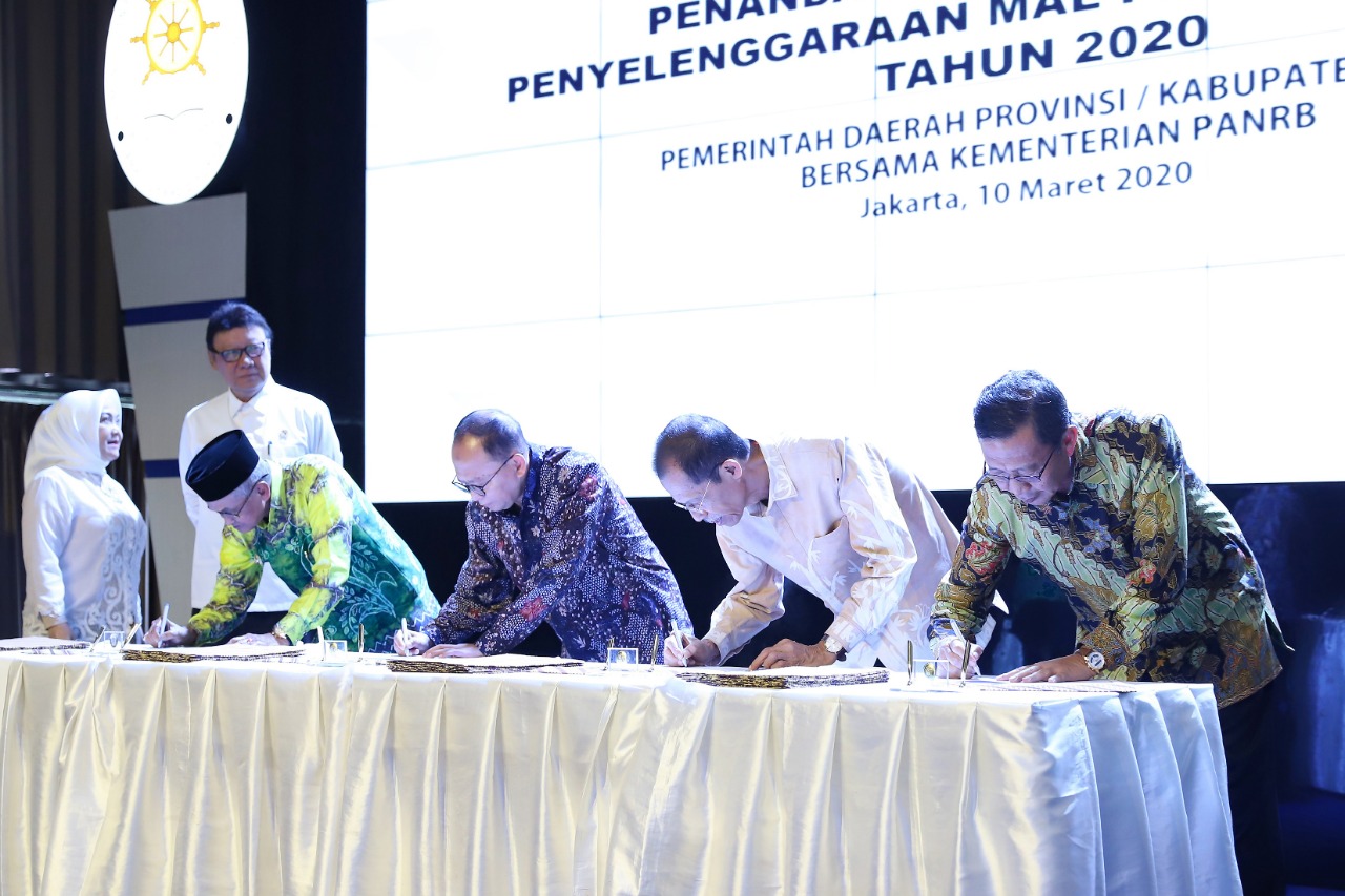Bupati Banjar KH Khalilurrahman dan Menteri PAN RB Tjahjo Kumolo menandatangani komitmen bersama penyelenggaraan Mal Pelayanan Publik (MPP) tahun 2020, di kantor Kementerian PANRB, Selasa (10/3/2020). foto: mckominfobanjar