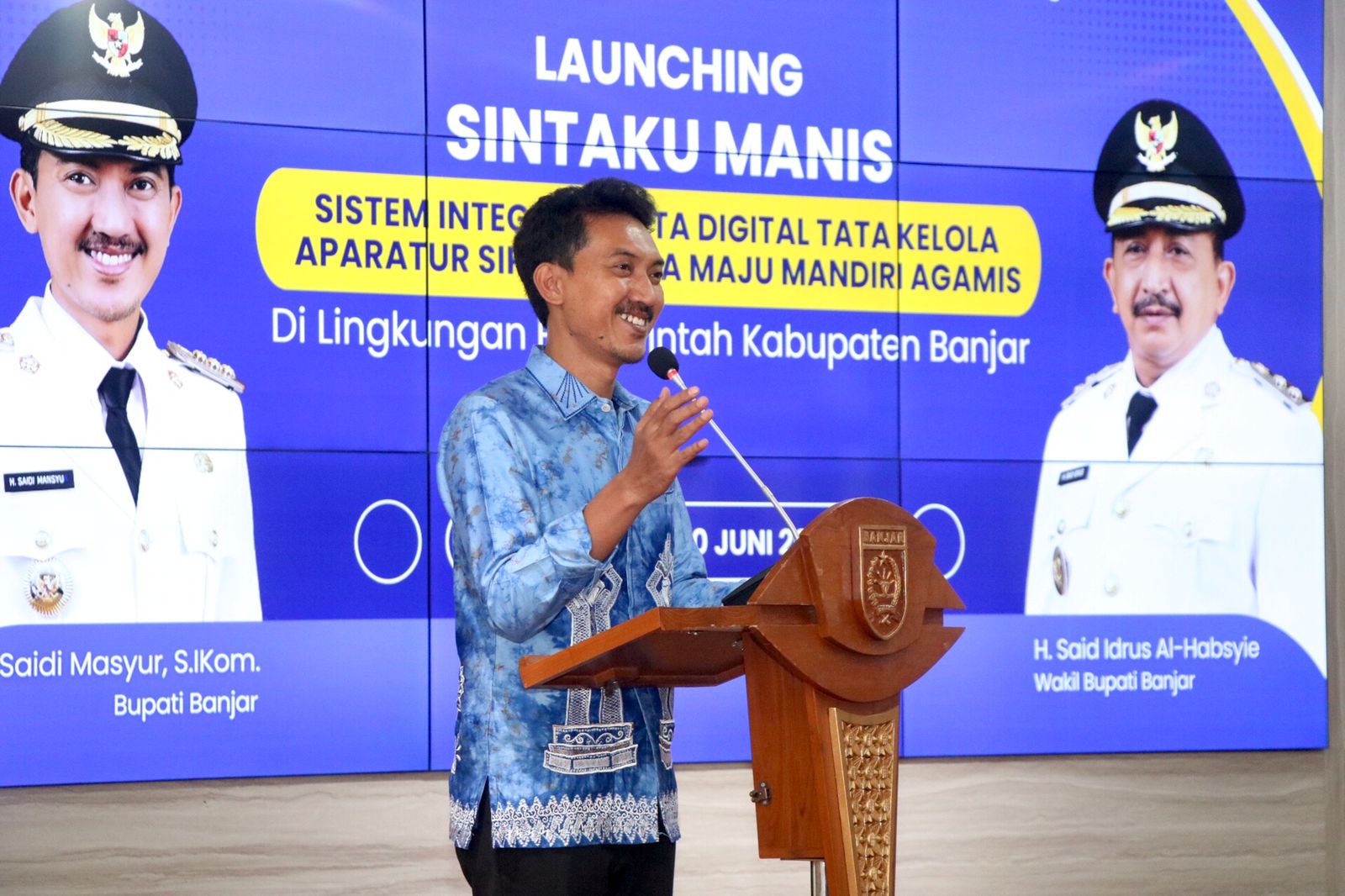 Launching Sintaku Manis ditandai dengan penekanan tombol layar oleh Bupati Banjar didampingi Ketua TP PKK dan Kepala BKPSDM, disaksikan para kepala SKPD dan camat serta sejumlah undangan. (Kanalkalimantan.com/dkispbanjar/kk)