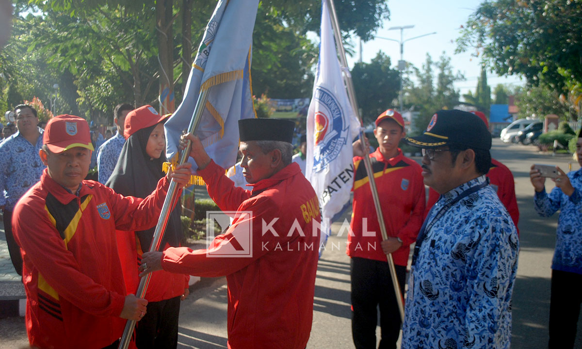 Pelepasan kontingen POPDA ini dilaksanakan bersamaaan dengan kegiatan apel kerja gabungan untuk memperingati hari kesadaran nasional di halaman Pemkab Banjar, Senin (19/3).