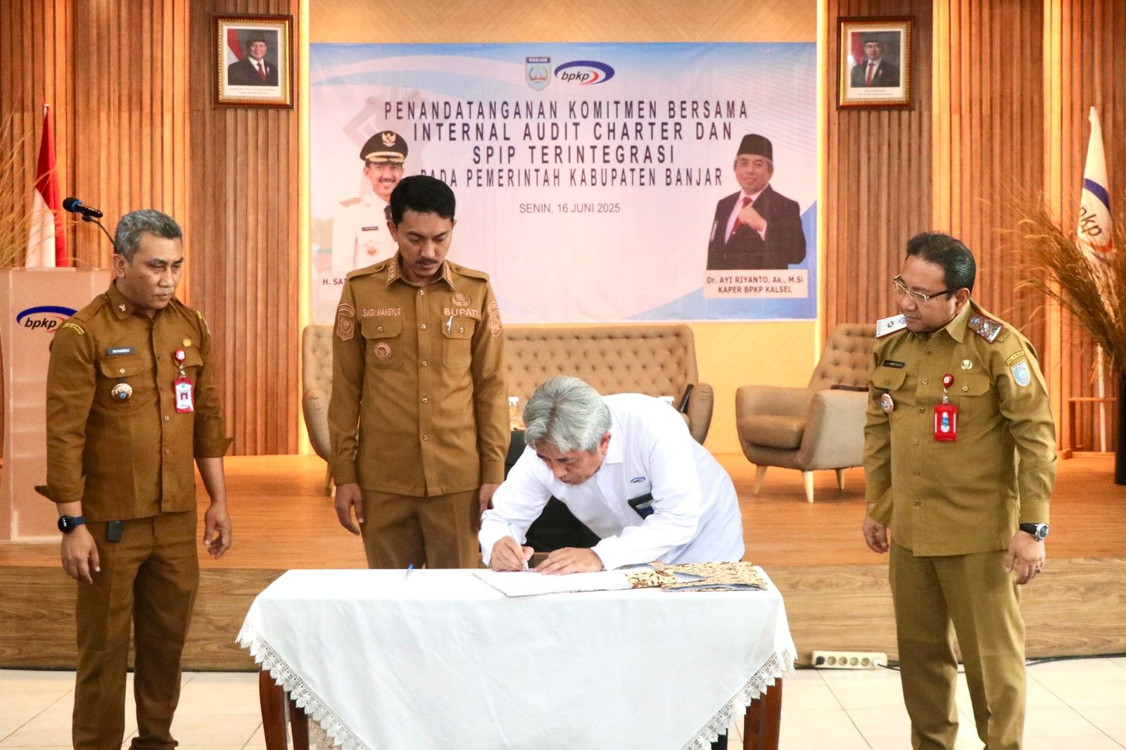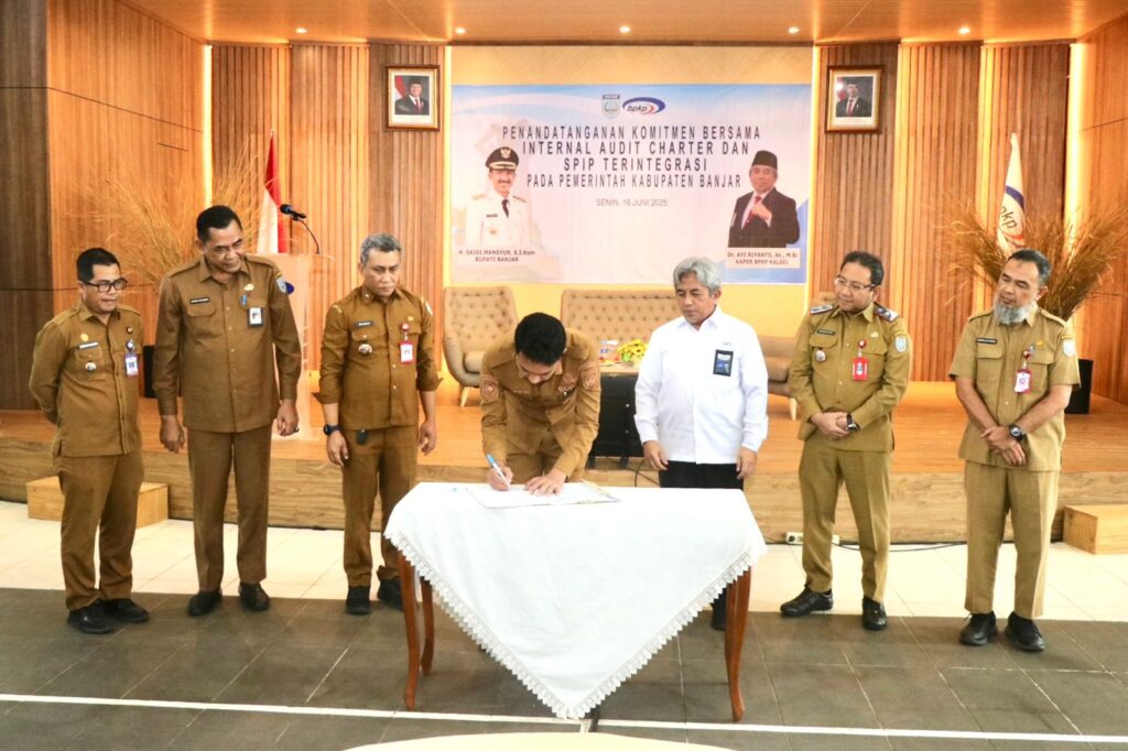 KANALKALIMANTAN.COM, BANJARBARU – Bupati Banjar H Saidi Mansyur melakukan penandatanganan komitmen bersama persetujuan Internal Audit Charter (IAC) dan penguatan Sistem Pengendalian Intern Pemerintah (SPIP) Terintegrasi, di Aula Kantor Badan Pengawasan Keuangan dan Pembangunan (BPKP) Perwakilan Kalimantan Selatan, Senin (16/6/2025) pagi.