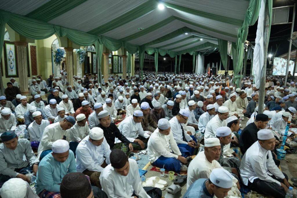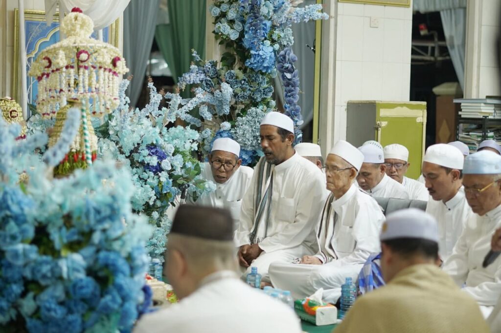 KANALKALIMANTAN.COM, MARTAPURA – Mengenakan baju muslim warna putih dipadu sarung warna biru, Bupati Banjar H Saidi Mansyur duduk bersama habaib, alim ulama serta guru-guru agama, khusyuk mengikuti haul ke-88 Syekh Muhammad Kasyful Anwar bin H Ismail Al Banjari, di Desa Melayu Ilir, Kecamatan Martapura Timur, Kabupaten Banjar, Rabu (1/4/2026) malam.