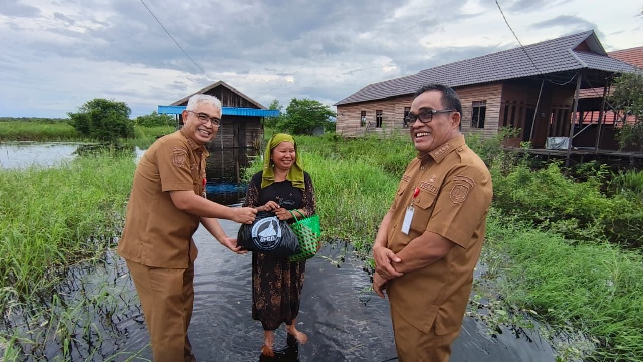 KANALKALIMANTAN.COM, AMUNTAI – Bupati Hulu Sungai Utara (HSU) H Sahrujani bersama Wakil Bupati HSU Hero Setiawan menyerahkan bantuan paket sembako kepada warga terdampak banjir di Desa Mawarsari dan Desa Pinangkara, Kecamatan Amuntai Tengah, Kabupaten HSU, Senin (29/12/2025) sore.