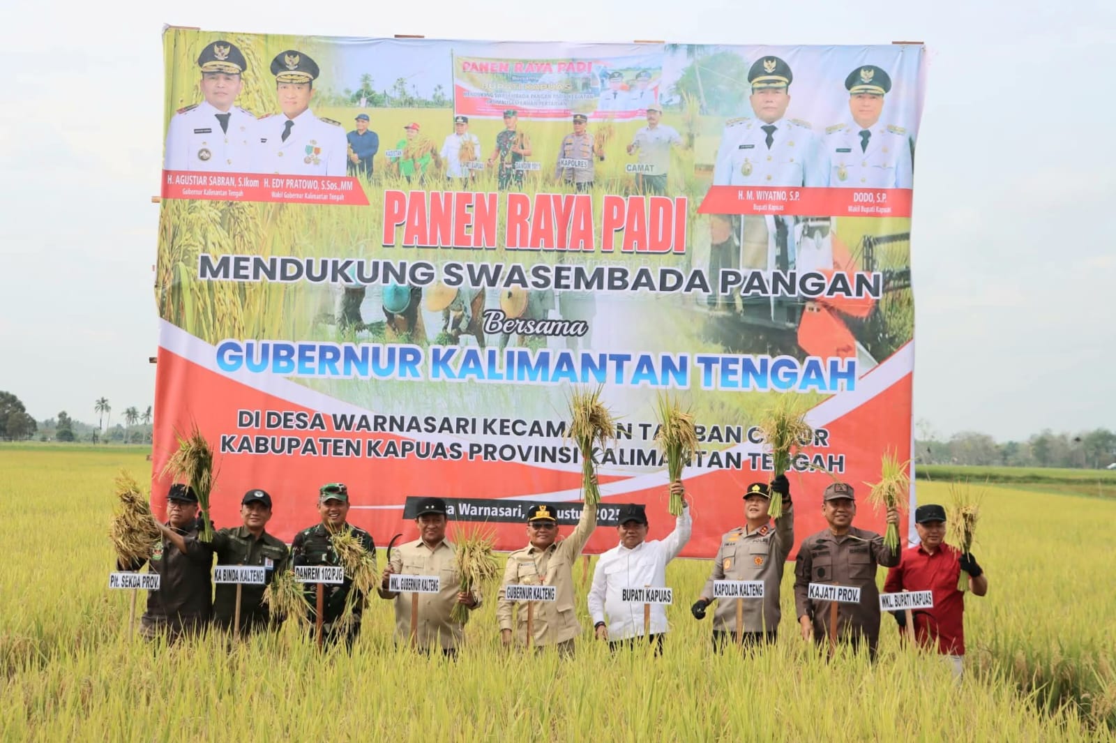 KANALKALIMANTAN.COM, KUALA KAPUAS – Bupati Kapuas, H Muhammad Wiyatno bersama Gubernur Kalimantan Tengah (Kalteng), H Agustiar Sabran mengikuti panen raya padi di sentra pertanian Desa Warnasari, Kecamatan Tamban Catur, Kabupaten Kapuas, Sabtu (9/8/2025).