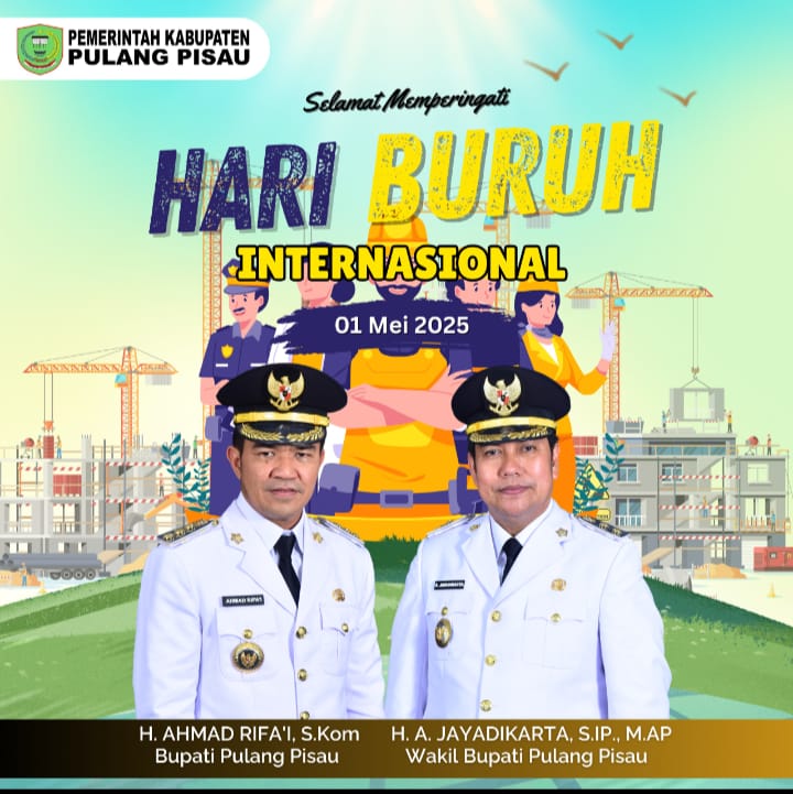 KANALKALIMANTAN.COM, PULANG PISAU – Bupati Pulang Pisau H Ahmad Rifa’i bersama Wakil Bupati H Ahmad Jayadikarta menyampaikan ucapan selamat memperingati Hari Buruh atau May Day 1 Mei 2025.