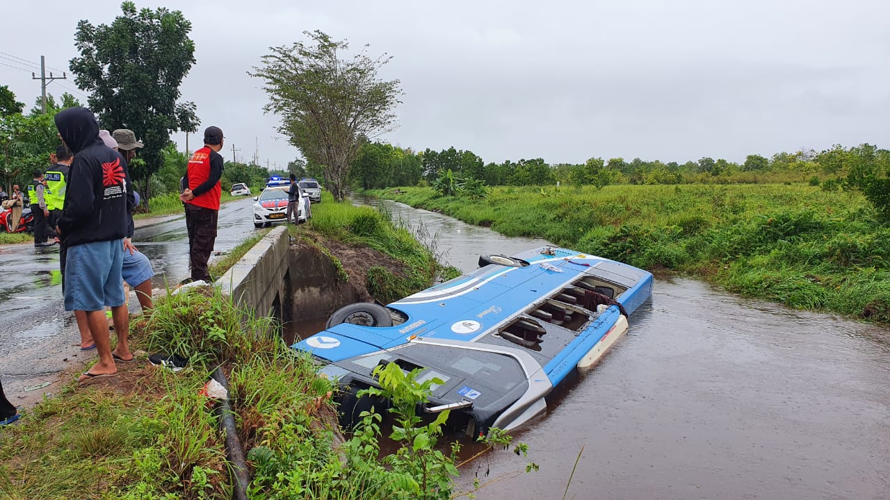 Sebuah bus Damri dari arah Kabupaten Lamandau nyemplung alias tercebur di sisi kiri jalan menuju arah Palangkaraya.