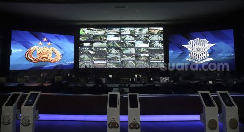Petugas memantau kamera pengawas tilang elektronik atau Electronic Traffic Law Enforcement (ETLE) melalui layar monitor di Gedung National Traffic Managemen Center (NTMC) Polri, Jakarta, Selasa (23/3/2021). [Suara.com/Angga Budhiyanto]