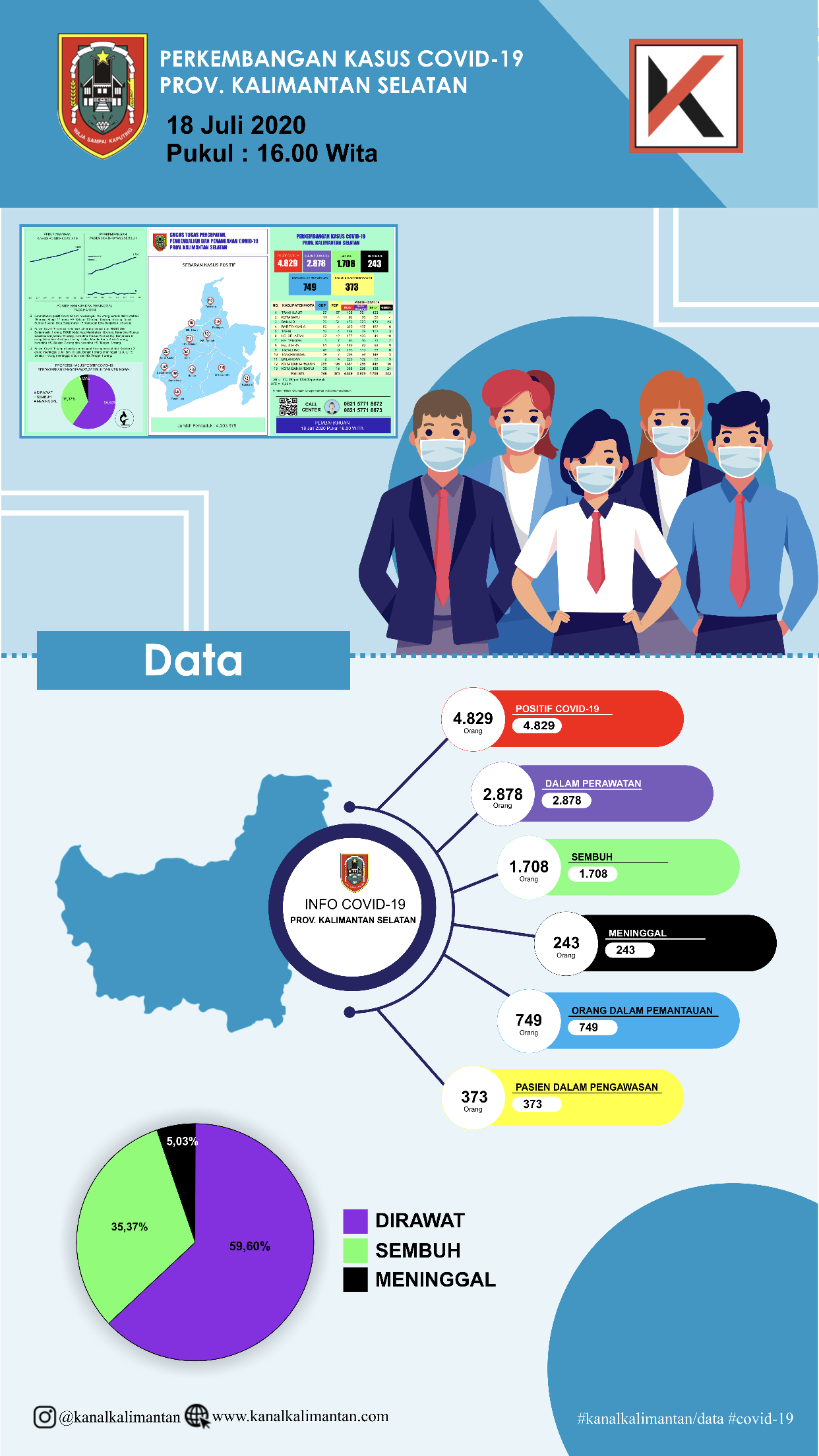 KANALKALIMANTAN.COM, BANJARMASIN – Kasus positif Covid-19 di Kalimantan Selatan masih terus bertambah. Sabtu (18/7/2020) jumlah pasien positif mencapai 4.829 kasus.