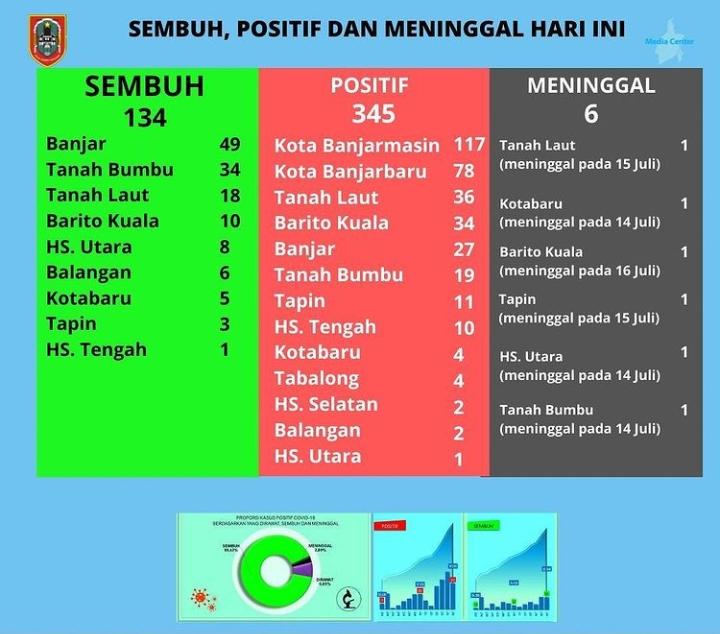 Kabar baiknya, diinformasikan sementara ada pasien yang sembuh sejumlah 134 orang. Banjar 49 orang, Tanah Bumbu 34 orang, Tanah Laut 18 orang, Barito Kuala 10 orang, Hulu Sungai Utara 8 orang, Balangan 6 orang, Kotabaru 5 orang, Tapin 3 orang, dan Hulu Sungai Tengah 1 orang.