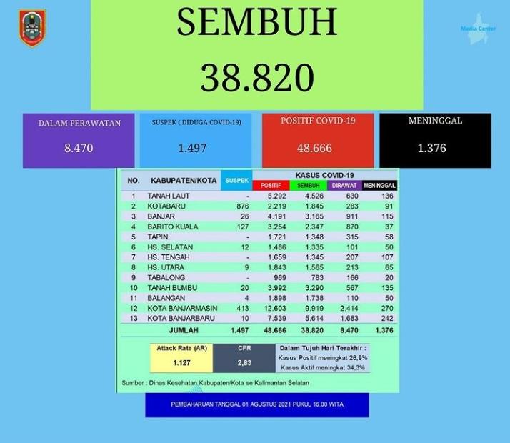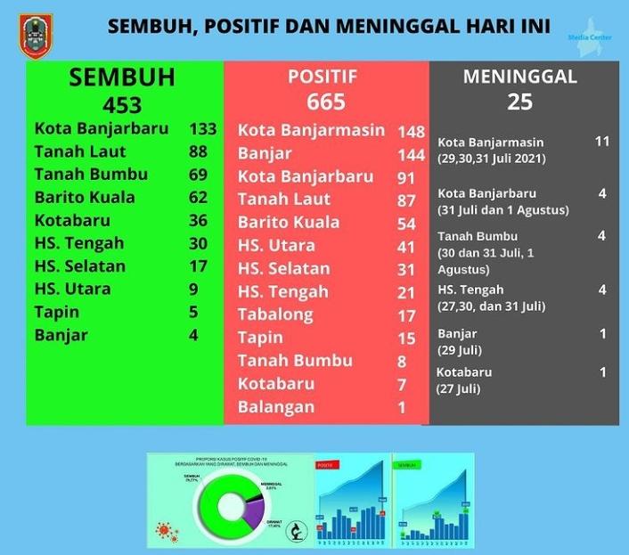 Laporan terbaru Gugus Tugas Percepatan Penanganan Covid-19 Kalsel pada Minggu (1/8/2021), mencatat jumlah kasus terkonfirmasi positif bertambah sebanyak 665 orang.