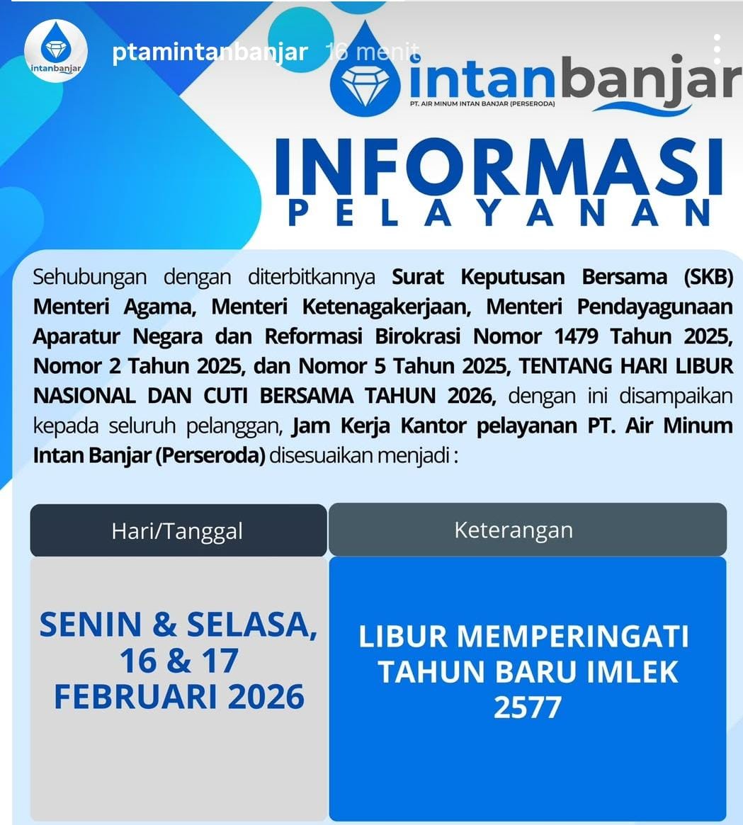 Melalui akun resminya PTAM Intan Banjar menyampaikan kepada seluruh pelanggan bahwa PTAM Intan Banjar akan libur pada Senin dan Selasa (16 dan 17 Februari 2026).