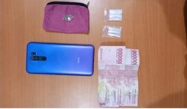 Dari hasil penggeledahan ditemukan 8 paket sabu dengan berat kotor 1,95 gram yang disimpan dalam tas kecil berwarna pink.