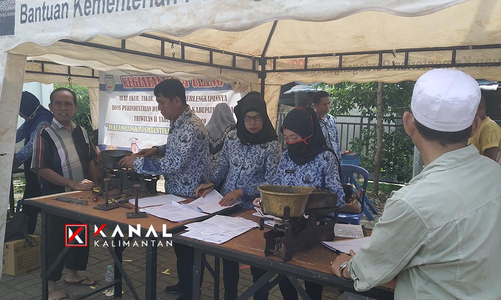 MARTAPURA, Dinas Perindustrian dan Perdagangan (Disperindag) Kabupaten Banjar lakukan tera ulang kepada pedagang di pasar ikan Martapura, Senin (17/6).