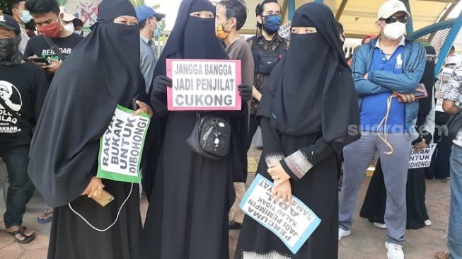 Sejumlah wanita yang merupakan pendukung Habib Rizieq Shihab saat mendatangi PN Jakarta Timur. (Suara.com/Yaumal)