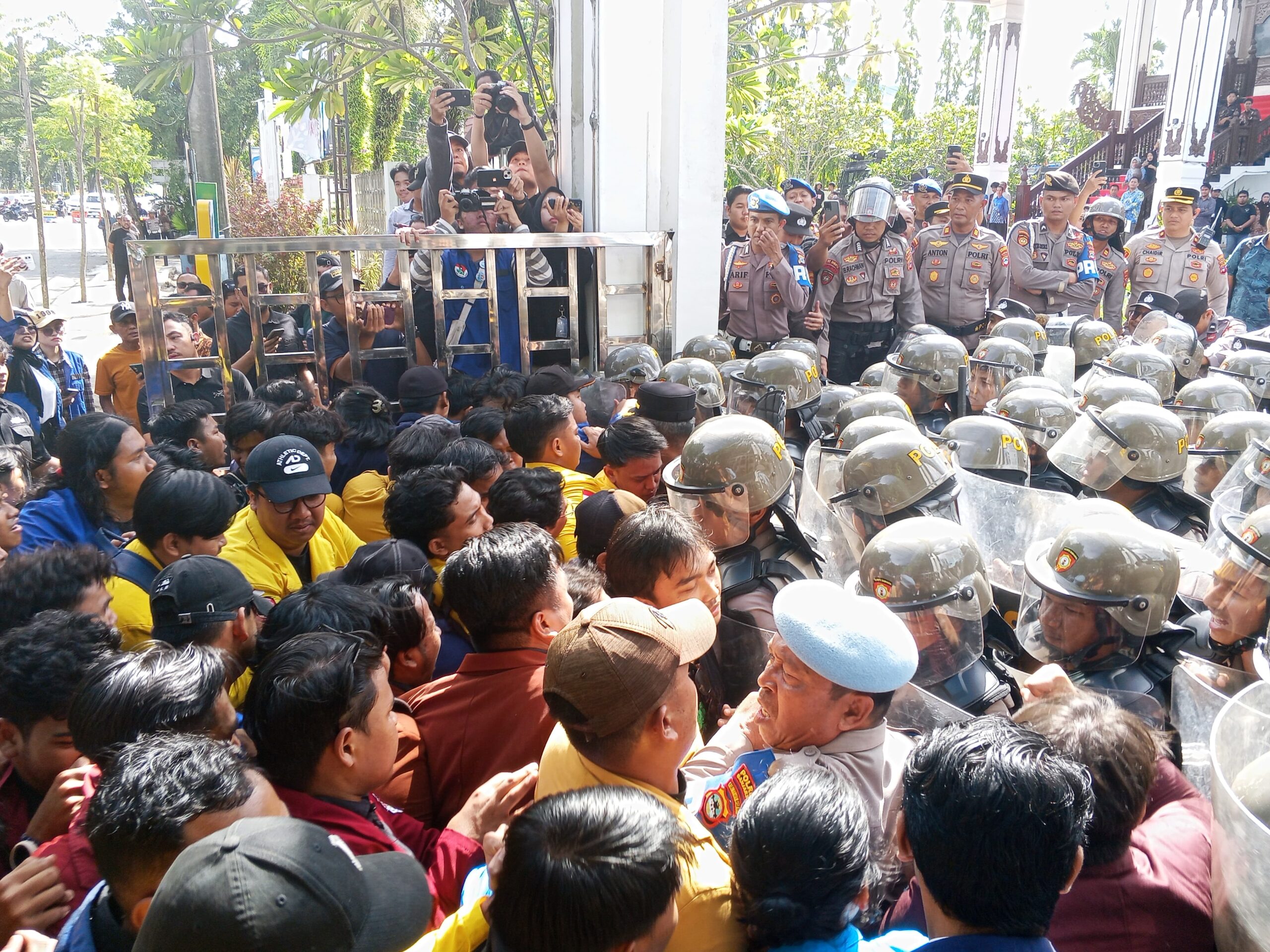 Bentrok terjadi dua kali sampai pintu gerbang sebelah kiri gedung DPRD Kalsel sampai terlepas akibat kericuhan.