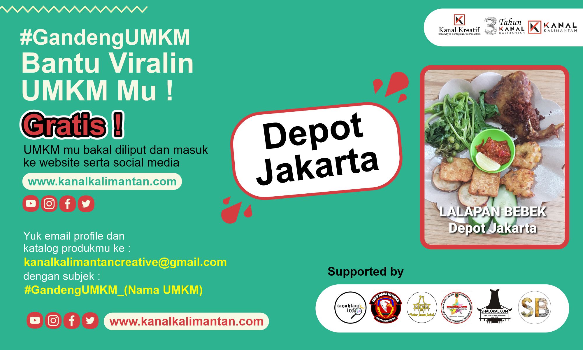 Pada program ini, Kanalkalimantan.com juga mengajak mitra pemilik dan pengelola akun media sosial untuk bersama membantu UMKM. Seperti halnya Shalokal Grup (shalokal,com & @shalokal.com_instabaiman), Kabar Banua Kalsel (@kabar_banua_kalsel), Info Daha Negara (@infodahanegara), Sejarah Banua (@sejarah_banua) dan Tanah Laut Info (@tanahlautinfo).