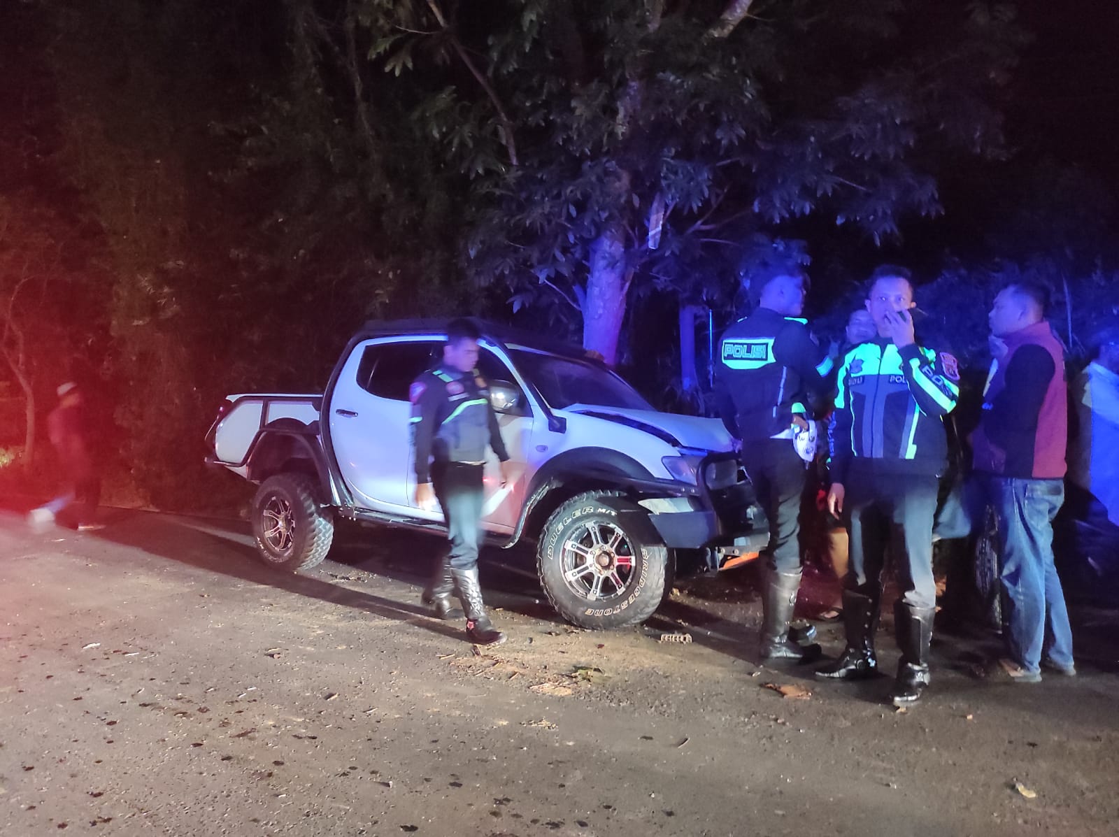 Diketahui mobil double cabin Mitsubishi Strada bernopol KT 8377 KH baru berhenti setelah mengalami patah shockbreaker ban depan sebelah kiri.
