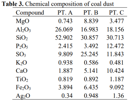 Berdasar kandungan bahan kimia, debu batu bara pada dasarnya memiliki kandungan silika (SiO2 ), aluminium oksida (Al 2 O3 ), sulfur trioksida (SO3 ), besi (ferro) oksida (Fe 2 O 3 ), fosforus pentoksida (P 2 O 5 ), dan beberapa bahan kimia lainnya (Tabel 3, Wahyudi et al., 2022).