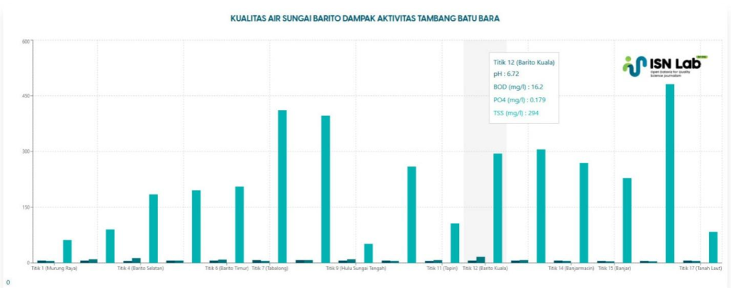 Hasil riset para ilmuwan yang disajikan pada portal ISN Lab terkait kualitas air dan dampaknya akibat aktivitas tambang batu bara menunjukkan, Sungai Barito mengalami pencemaran ringan dengan konsentrasi DO berkisar antara 4,74 mg.l−1 – 5,36 mg.l−1, di bawah standar 6 mg.l−1.