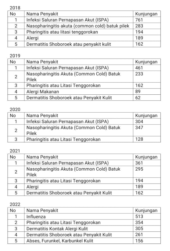 Kanal kalimantan juga memperoleh data kunjungan warga di Puskesmas Lepasan dari Dinas Kesehatan Barito Kuala, lalu mendapati 10 penyakit terbanyak di Kecamatan itu dari 2018 hingga 2022. Kanal kalimantan mengelompokkan lima indikasi penyakit yang mengarah pada pencemaran kualitas udara seperti saluran pernafasan, iritasi kulit hingga alergi.