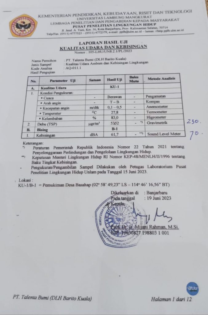 Kanal kalimantan mendapati data Laporan Hasil Uji Kualitas Udara dan Kebisingan, pada 15 Juli 2023. Foto: Narasumber, meminta dirahasiakan identitasnya.
