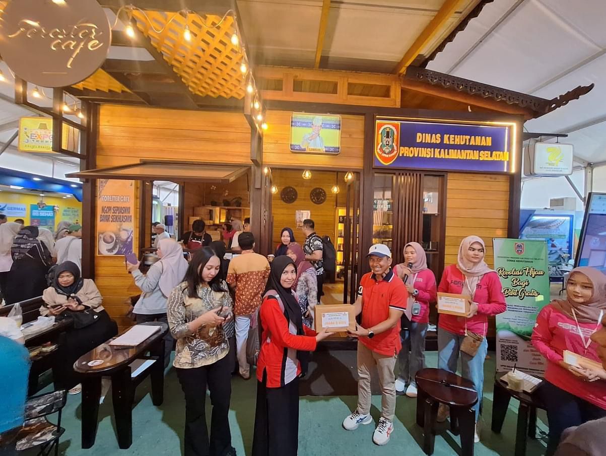 Sesuai temanya Stand Dishut Kalsel didesain Konsep Rumah Banjar yang dikompilasikan menjadi Cafe yang dinamakan Cafe Forester yang menyediakan ragam minuman kopi dari biji kopi pilihan hasil budidaya tanaman kopi KTH Binaan KPH dan Tahura Lingkup Dishut Kalsel, Cafe Forester ini menyediakan Kopi dengan tema “Ngopi sepuasnya dan Bayar seikhlasnya” dan disetiap harinya untuk menarik minat pengunjung Stand Dishut Kalsel juga Mengadakan kuis-kuis berhadiah menarik melalui Game Kahoot dengan pemberian soal-soal edukasi tentang Kehutanan.(Kanalkalimantan.com/al)