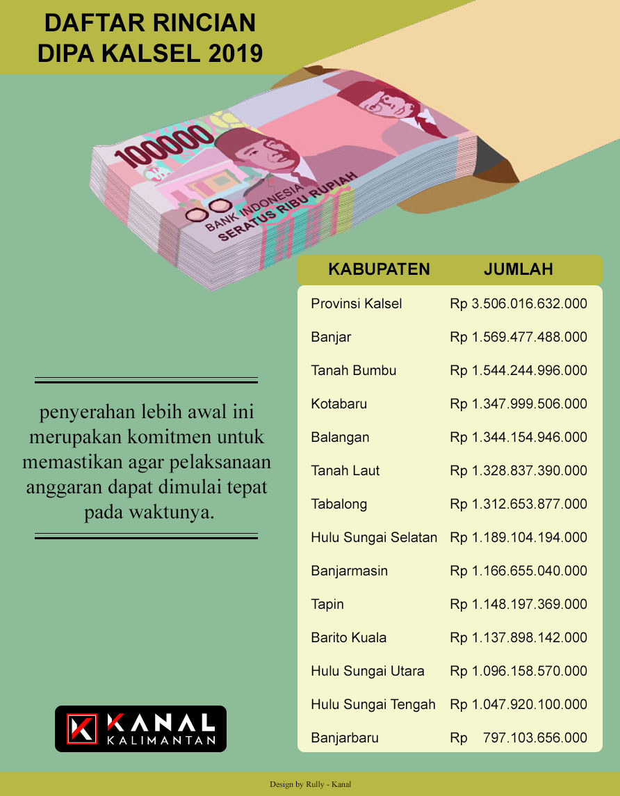 Penyerahan DIPA tersebut diserahkan, Kamis (20/12) di aula Mahligai, Bajarmasin, kepada masing-masing penerima anggaran. Baik pemerintah kabupaten/kota, maupun jajaran SKPD provinsi. Khusus untuk porivinsi Kalimantan Selatan, alokasi anggaran yang telah ditetapkan untuk tahun anggaran 2019 berjumlah sebesar Rp 28,08 triliun. (Lihat Grafis, Red)