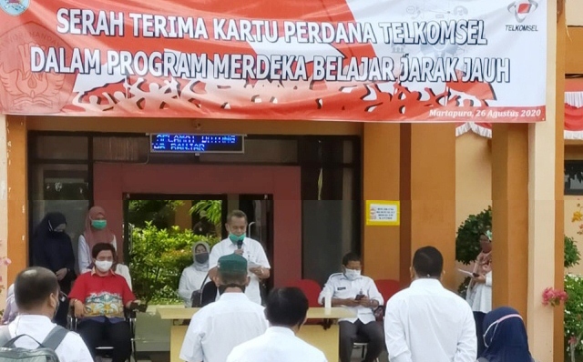 KANALKALIMANTAN.COM, MARTAPURA – Penerapan belajar dari rumah atau belajar dari jarak jauh secara daring (dalam jaringan) di tengah pandemi Corona Virus Disease (Covid-19), Dinas Pendidikan (Disdik) Kabupaten Banjar membagikan sebanyak 9.183 keping kartu perdana Telkomsel untuk 50 SMP di Kabupaten Banjar, Rabu (26/8/2020).