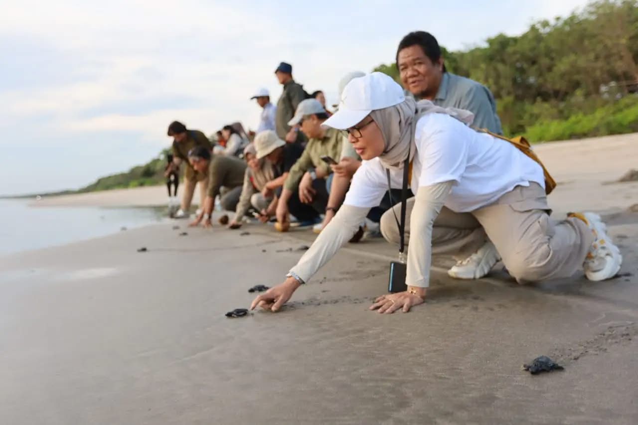 Dalam kegiatan ini, puluhan tukik berusia satu minggu dilepasliarkan sebagai bagian dari upaya perlindungan terhadap spesies penyu yang semakin terancam.