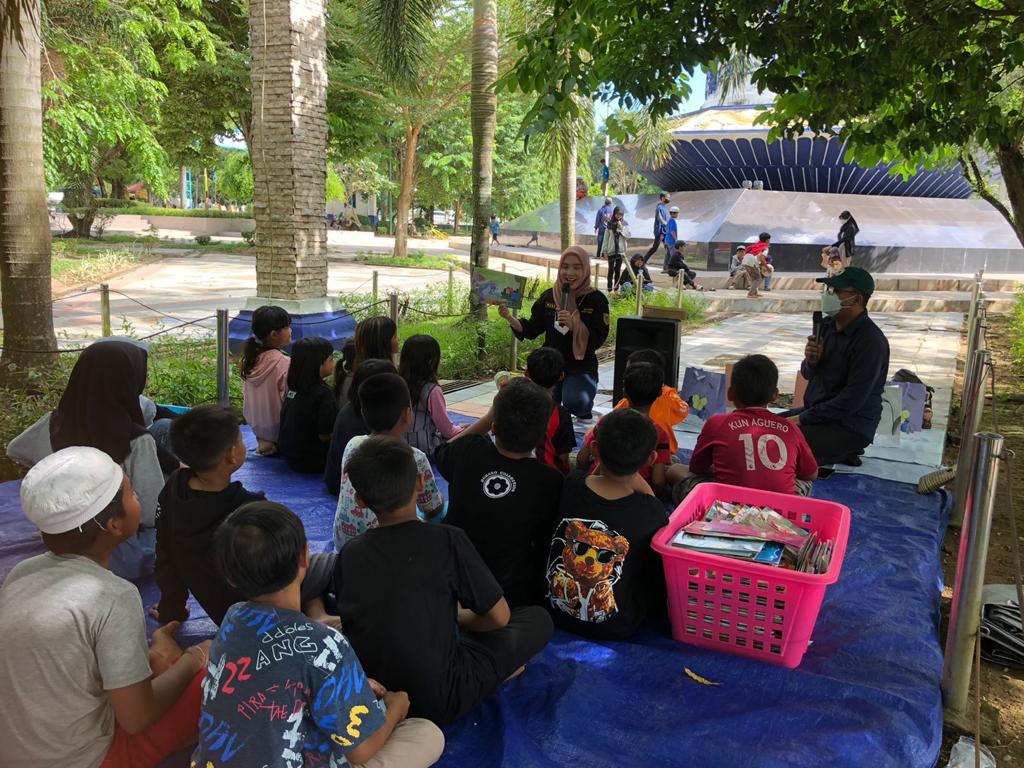 Taman Cahaya Bumi Selamat Martapura, gerakan literasi diinisiasi para penerima beasiswa cendikia Baznas mpengunjung dan anak-anak sekitar untuk diajak dalam kegiatan Lapak Membaca.