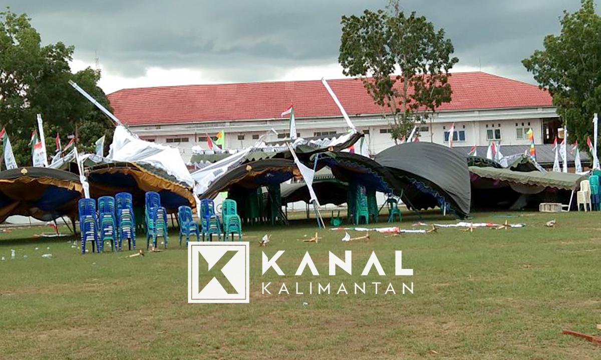 AMUNTAI, Sejumlah tenda yang akan digunakan untuk menggelar acara puncak TNI Manunggal KB Kesehatan (TMKK) Tingkat Nasional sekaligus peringatan Hari Jadi Kabupaten Hulu Sungai Utara (HSU) ke-66 di lapangan Pahlawan Amuntai roboh lantaran diterjang angin kencang, Minggu (29/4) sore.
