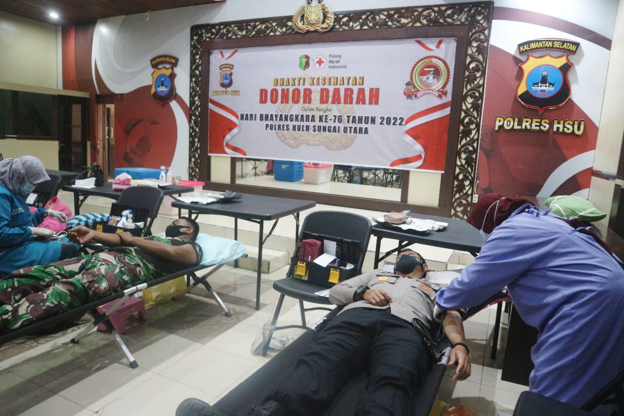Bakti kesehatan donor darah bekerjasama dengan Unit Transfusi Darah (UTD) RSUD Pambalah Batung Amuntai diikuti anggota TNI Kodim 1001/HSU-BLG dan anggota Polres HSU bersama anggota Bahayangkari.