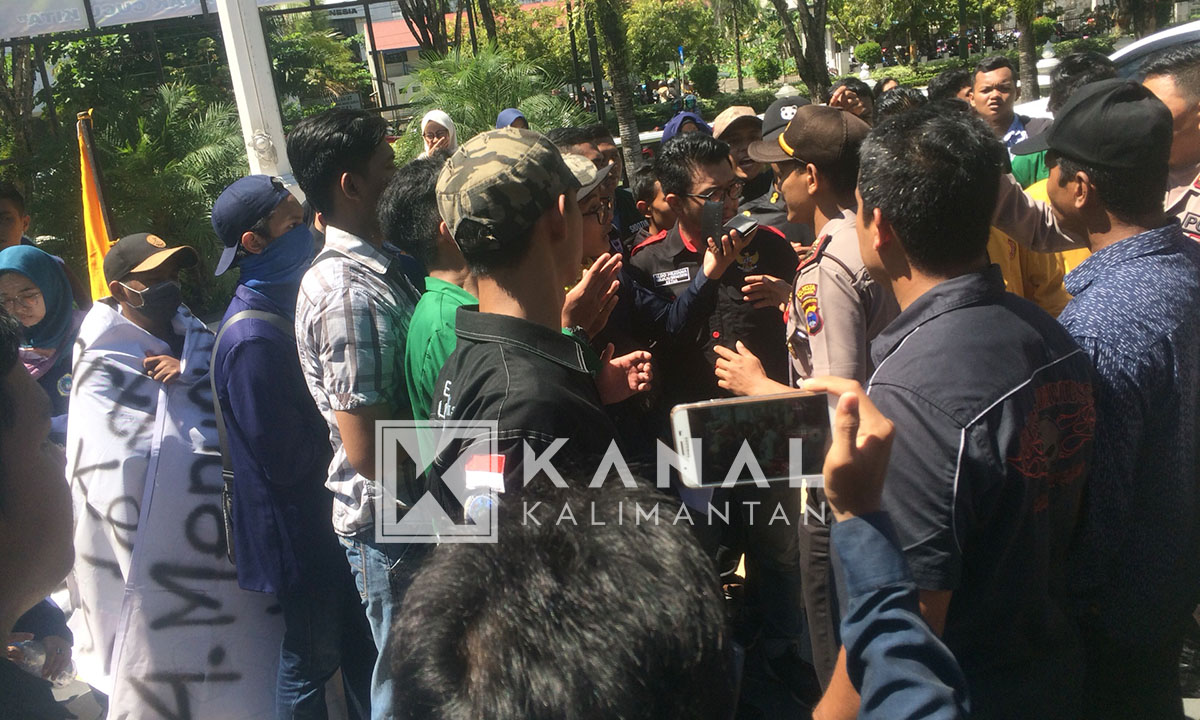 BANJARMASIN, Aksi Demo dari Gabungan dari beberapa mahasiswa di halaman Kantor DPRD Provinsi Kalimantan Selatan, Rabu (16/5), diwarnai insiden ketersinggungan mahasiswa atas apa yang dilakukan seorang oknum polisi yang menjaga demo.