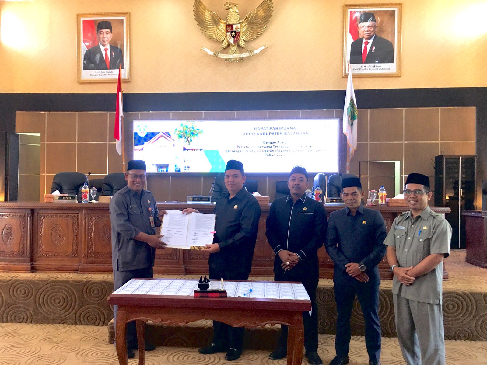 Setelah mendapatkan persetujuan dari DPRD Balangan, agenda dilanjutkan dengan penandatanganan persetujuan bersama terhadap lima buah Raperda Sekretaris Daerah Kabupaten Balangan, Ketua DPRD Kabupaten Balangan, Wakil I dan Wakil II DPRD Kabupaten Balangan.