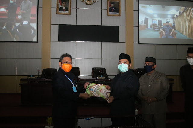 Bupati Banjar menyampaikan keputusan melalui video conference dari kediaman mengucapkan terimakasih untuk pengesahan Raperda tentang penyelenggaran perpustakaan dan penyeleggaraan kearsipan.