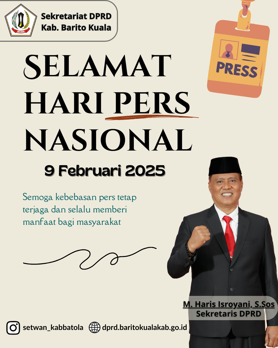 KANALKALIMANTAN.COM,MARABAHAN- Sekretariat DPRD Barito Kuala mengucapkan selamat Hari Pers Nasional (HPN) 2025. Peringatan HPN dianggap menjadi momentum untuk menegaskan pentingnya kebebasan pers dalam menyampaikan informasi yang akurat dan bermanfaat bagi masyarakat.