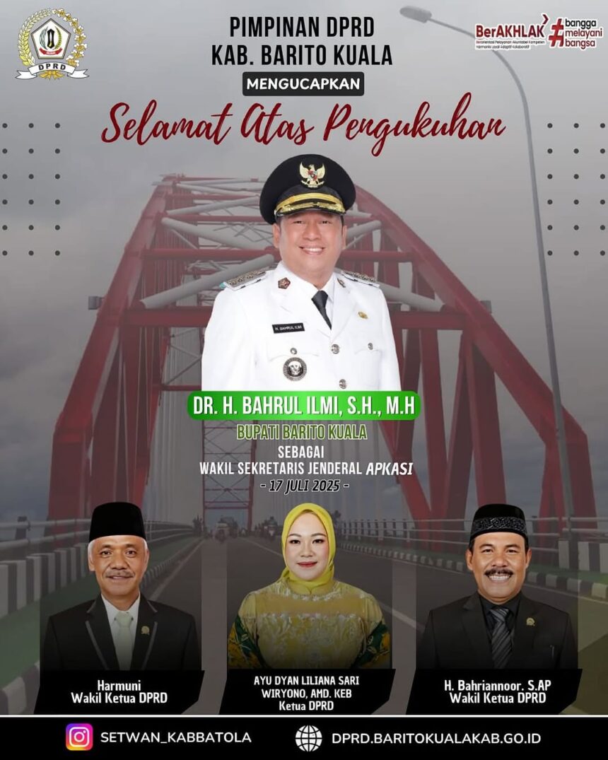KANALKALIMANTAN.COM, MARABAHAN- Pimpinan Dewan Perwakilan Rakyat Daerah (DPRD) Kabupaten Barito Kuala memberikan ucapan selamat sekaligus apresiasi kepada Bupati Barito Kuala, Dr. H. Bahrul Ilmi, S.H., M.H., yang resmi dikukuhkan sebagai Wakil Sekretaris Jenderal Asosiasi Pemerintah Kabupaten Seluruh Indonesia (APKASI) pada 17 Juli 2025.