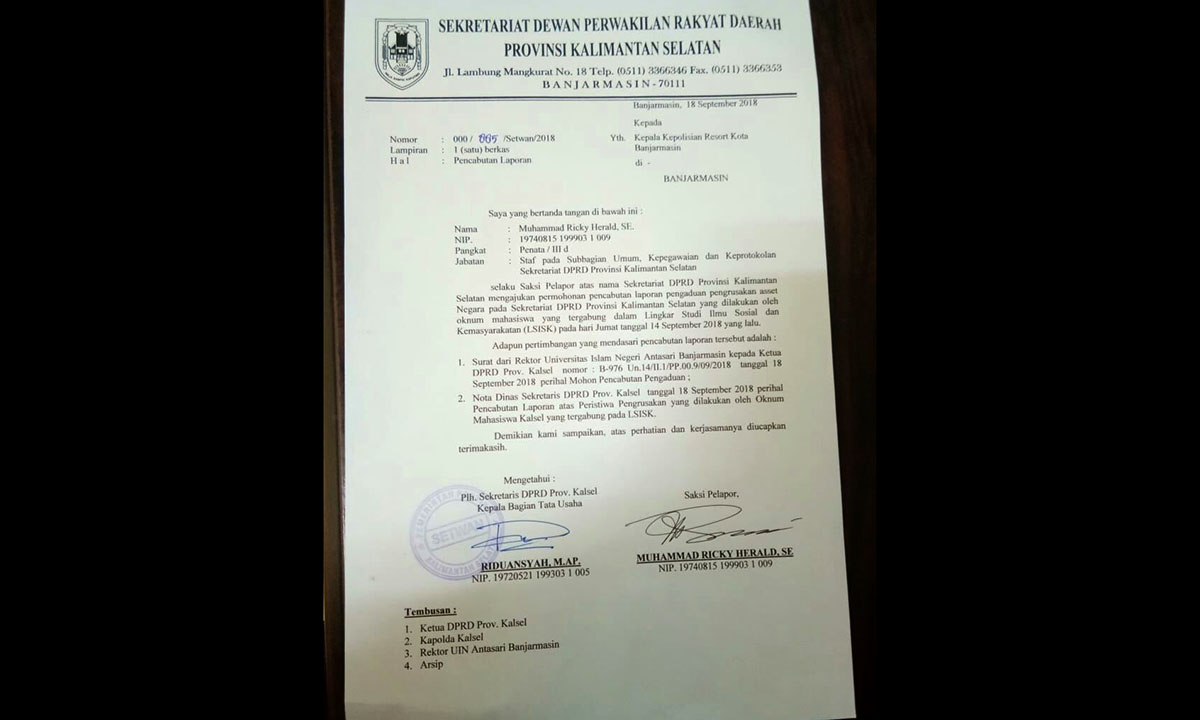 Dalam surat tersebut disampaikan, Ricky selaku saksi pelapor atas nama Sekteretariat DPRD Kalsel mengajukan permohonan pencabutan laporan pengaduan pengerusakan aset negara pada Sekrtetariat DPRD kalsel yang dilakukan oknum mahasiswa yang tergabung dalam Lingkar Studi Ilmu soial dan Kemasyarakatan (LSISK) pada Jumat 14 September 2018.