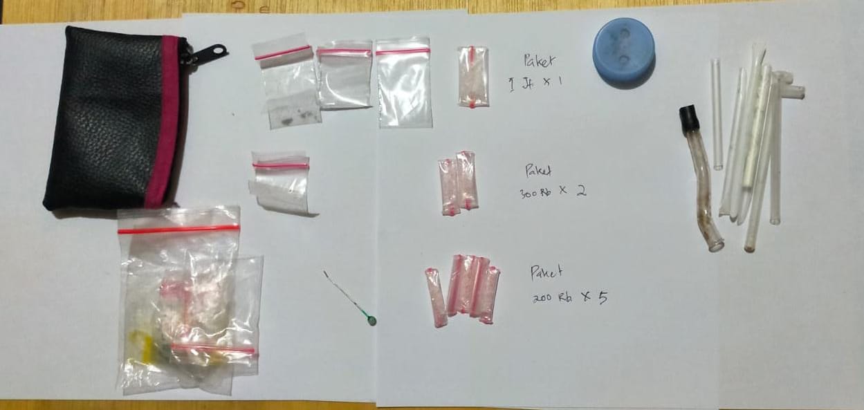 Selain itu, sambungnya, ada pula beberapa barang bukti lainnya seperti, 1 buah pipet, 1 pack plastik klik kosong, 1 buah jarum, 1 buah tutup botol atau tutup bong, 6 buah sedotan plastik, 1 unit mobil berwarna merah dengan Nopol DA 1256 ZAE, dan terakhir adalah uang tunai senilai Rp 1.100.000.