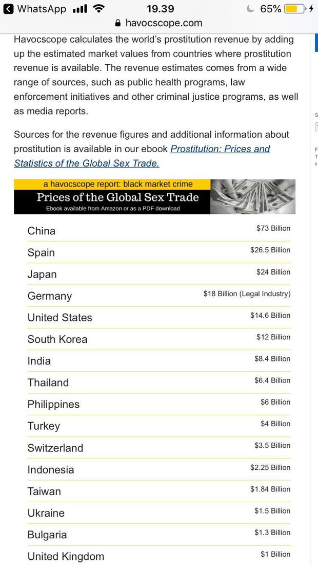 Dalam laporan itu, yang mengejutkan adalah ada nama Indonesia sebagai salah satu negara dengan perputaran uang dari prostitusi terbesar di dunia. Dikutip detikFinance, Havocscope mencatat total perputaran uang dari bisnis prostitusi mencapai US$ 186 miliar atau bila dihitung dengan kurs saat ini mencapai Rp 2.697 triliun (kurs: Rp 14.500/dolar AS).