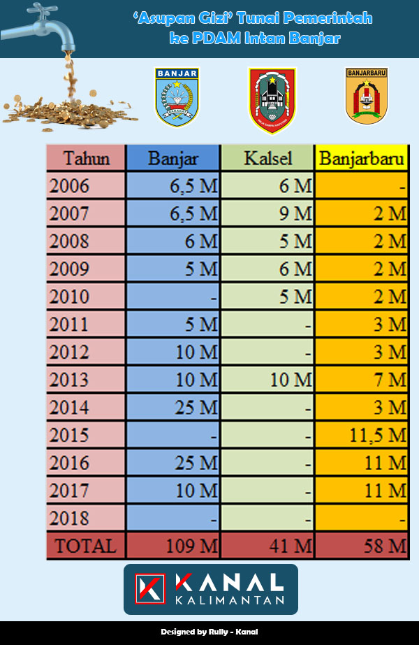 Dalam laporan PDAM Intan Banjar, Pemprov Kalsel tidak menyuntik modal sejak tahun 2014. Pemkab Banjar menyuntik dana Rp 10 miliar pada 2017 dan Rp 25 miliar pada 2018. Adapun Pemkot Banjarbaru menyuntik dana masing-masing Rp 11 miliar untuk tahun 2016 dan 2017.