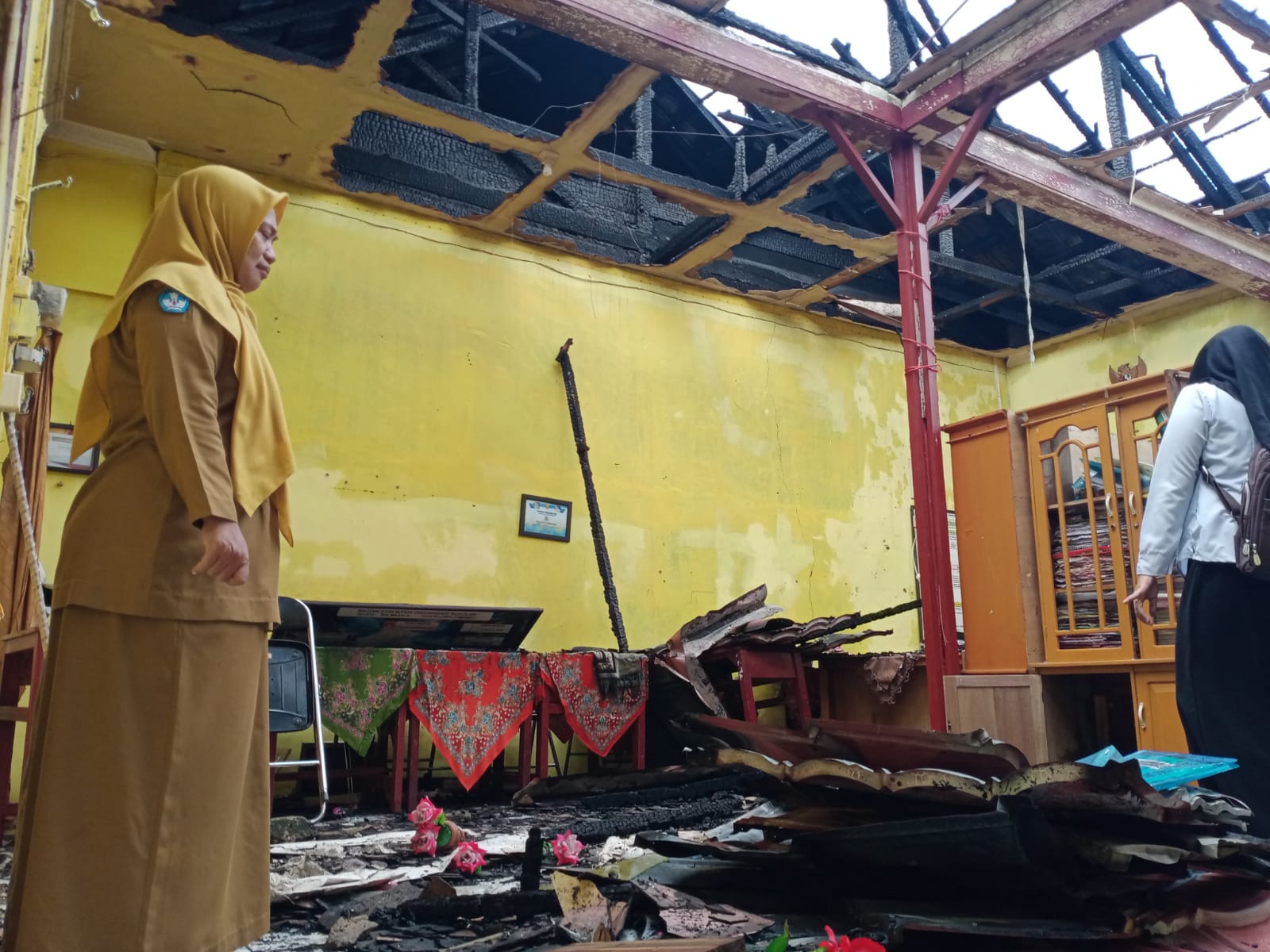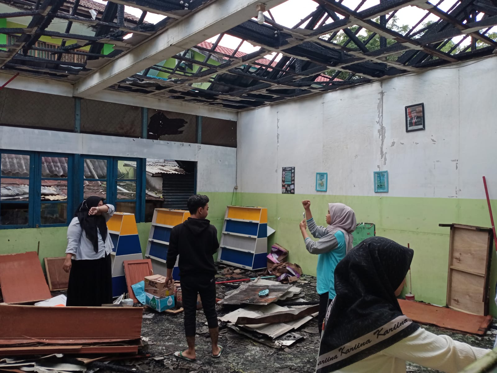 Sri memastikan ruang kelas tidak ada yang terbakar, kecuali beberapa bagian plafon mengalami kerusakan.