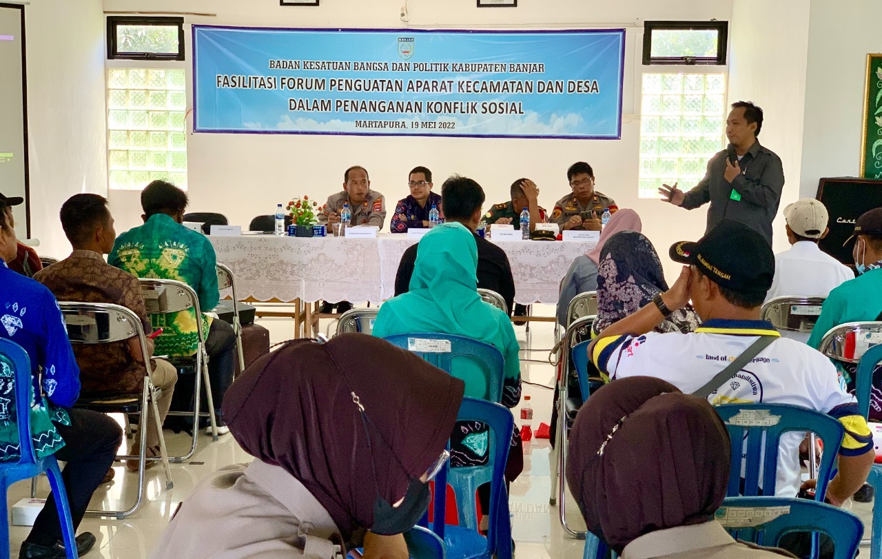 KANALKALIMANTAN.COM, MARTAPURA- Badan Kesbangpol Kabupaten Banjar melaksanakan Fasilitasi Forum Penguatan Aparat Kecamatan dan Desa Dalam Penanganan Konflik Sosial, di Aula Kecamatan Martapura Barat, Kamis (19/5/2022)