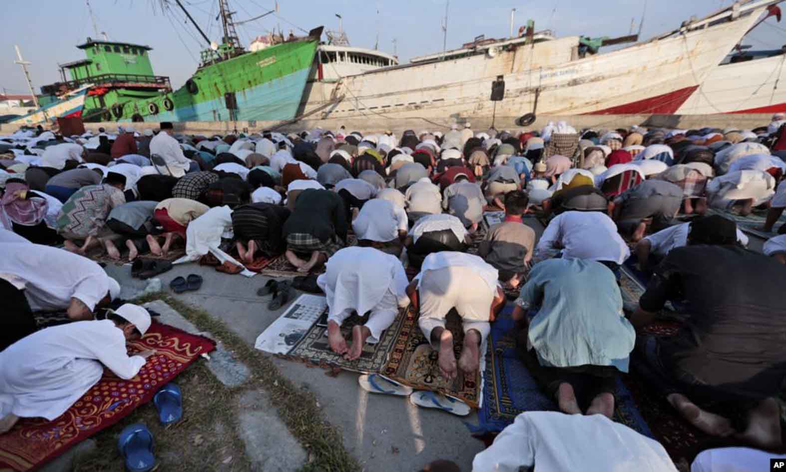 Para jemaah salat melakukan Idul Fitri di pelabuhan Sunda Kelapa, Jakarta, Rabu, 5 Juni 2019. Foto: Dita Alangkara/AP via VOA