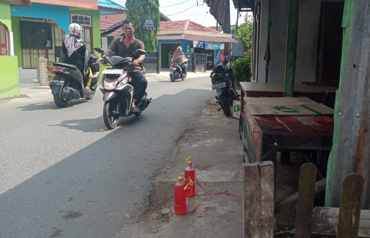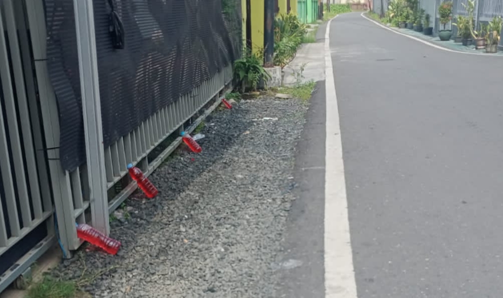 Botol air mineral berisi air merah yang disusun berjejer tersebut cukup menarik perhatian pengguna jalan, rata-rata 3 sampai 5 buah botol diletakan warga di pekarangan rumah masing-masing.