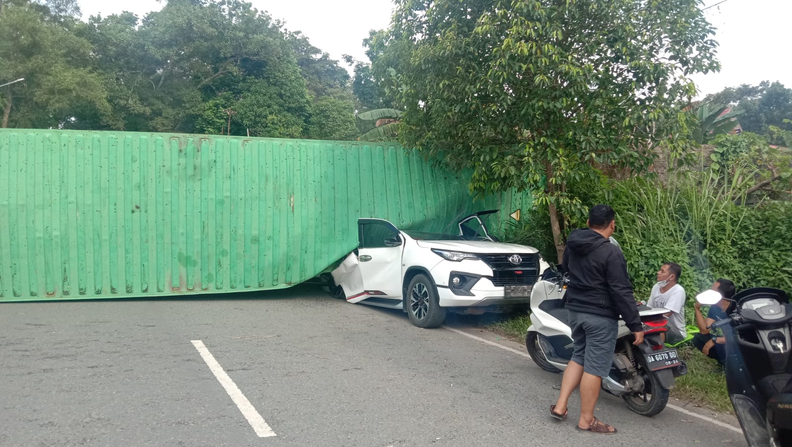 Akibat kejadian, truk berbadan besar terguling itu, sebuah mobil Toyota Fortuner ringsek tertindih kontainer warna hijau. Tidak ada korban jiwa, hanya sopir mengalami luka ringan.