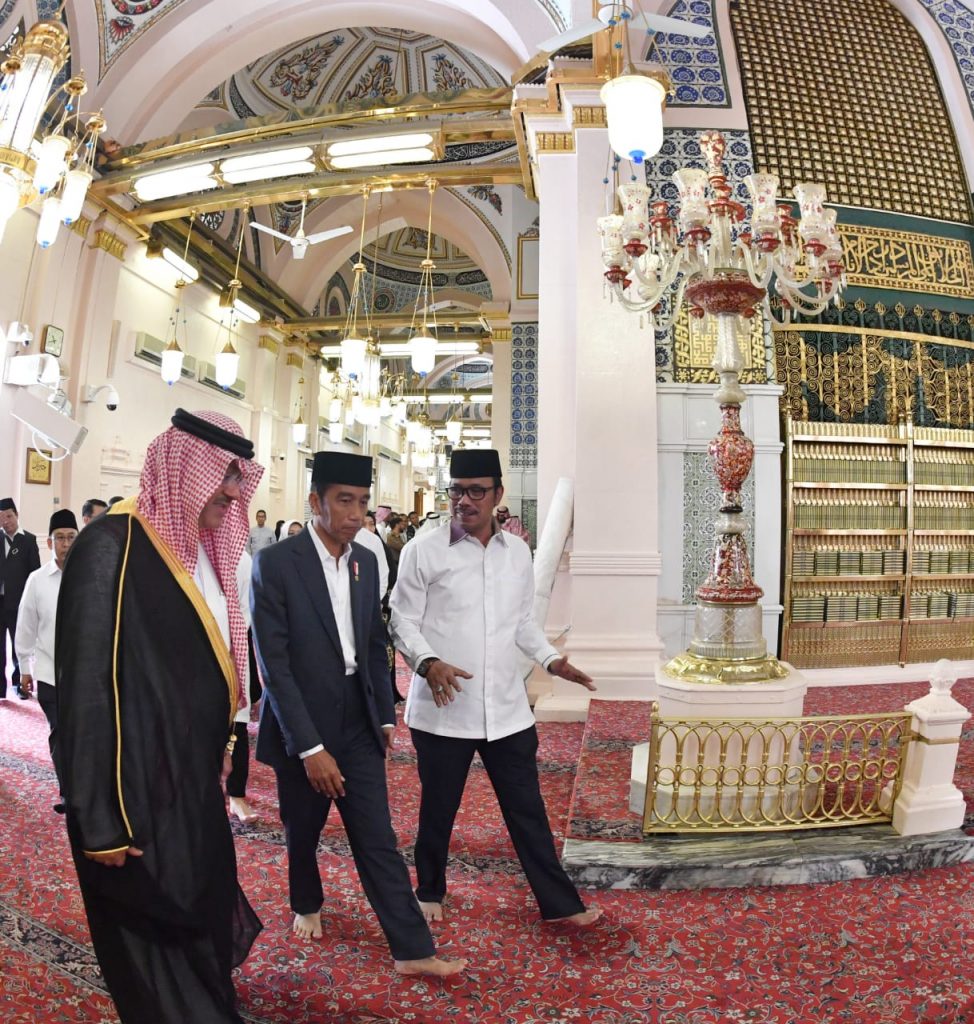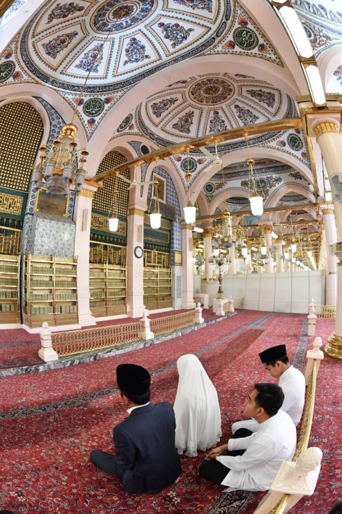 Presiden Joko Widodo dan Ibu Negara Iriana Joko Widodo bersama rombongan, sebelumnya menyambangi Masjid Nabawi di kota Madinah, Arab Saudi.